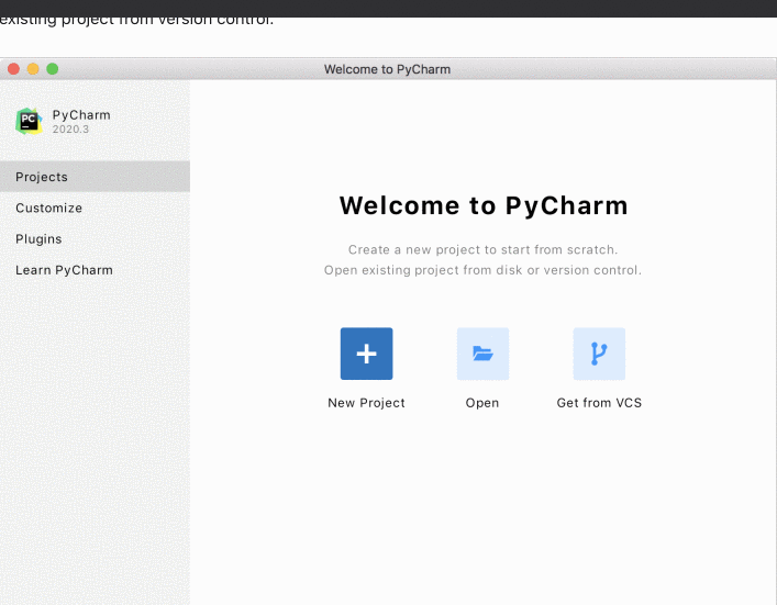 When you open PyCharm after it has installed, you should see the welcome screen below. Click on the New Project Button.