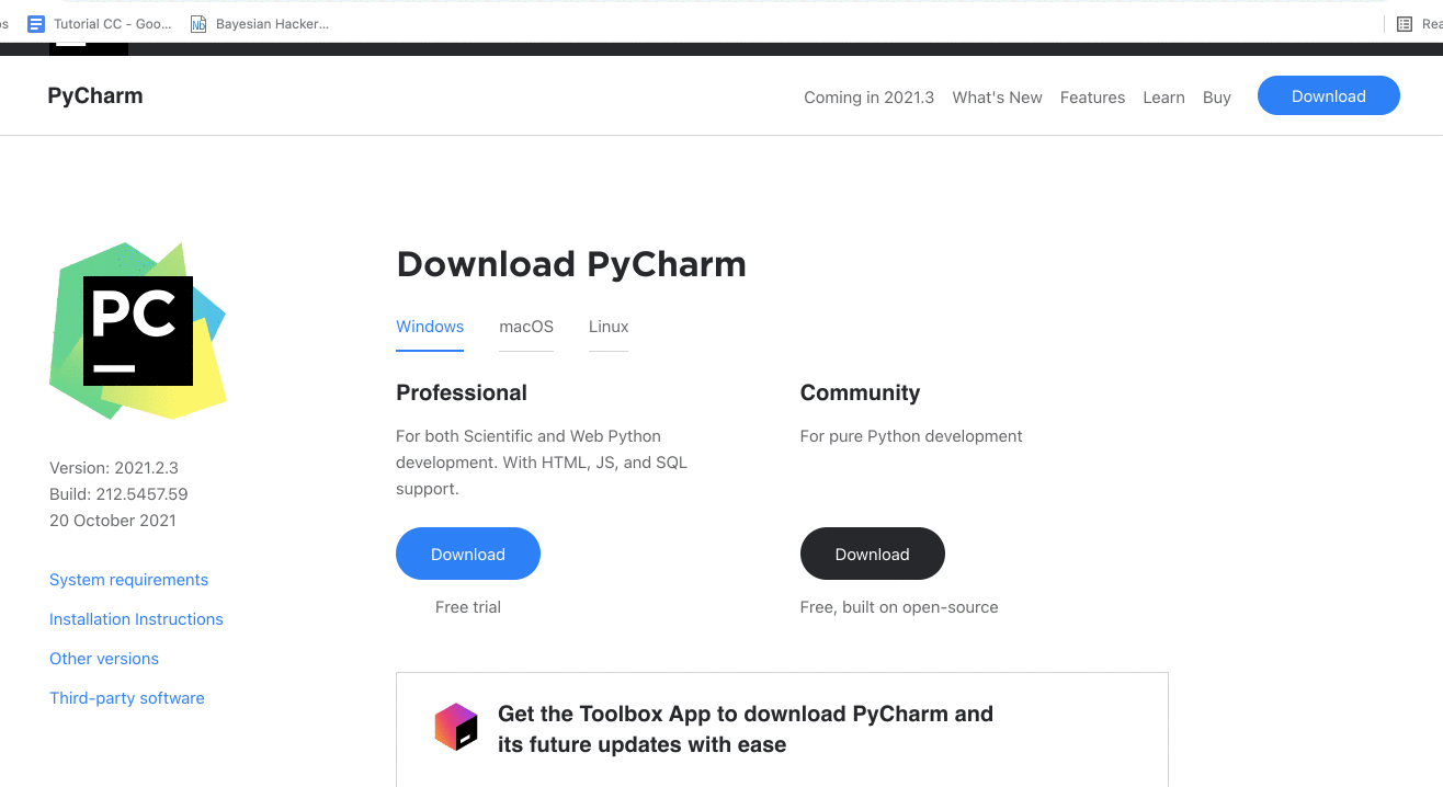 Next, we’ll need to hop over to the PyCharm page and download the community version.